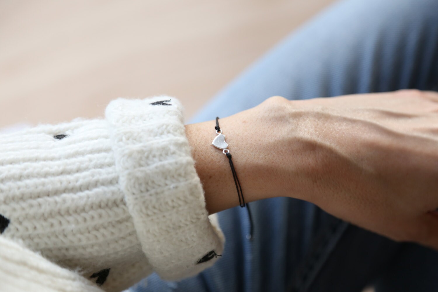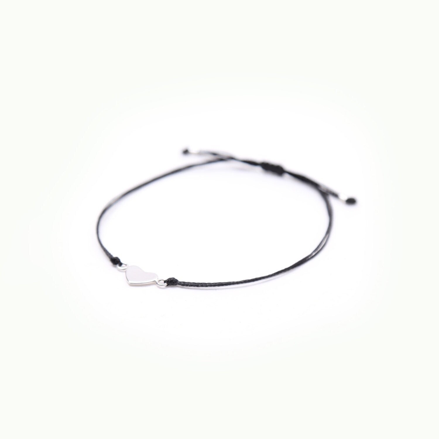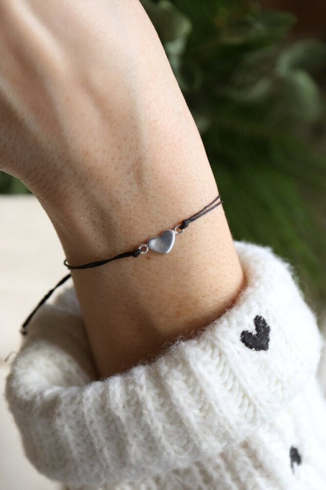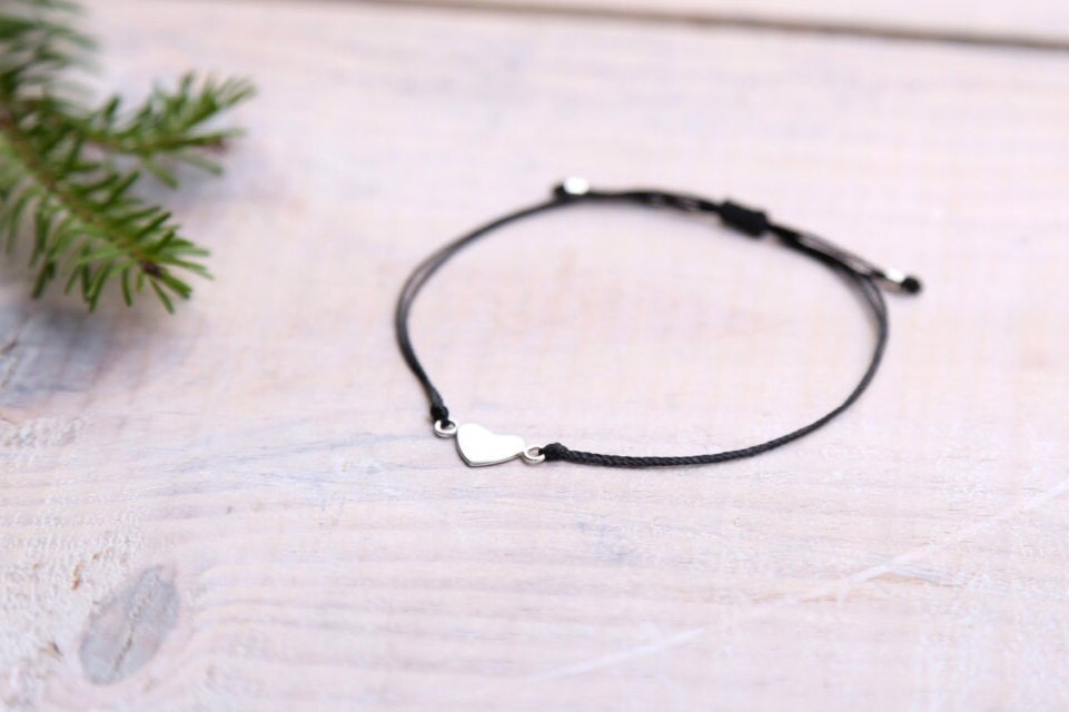 Delicate heart bracelet in real silver on a black nylon thread.